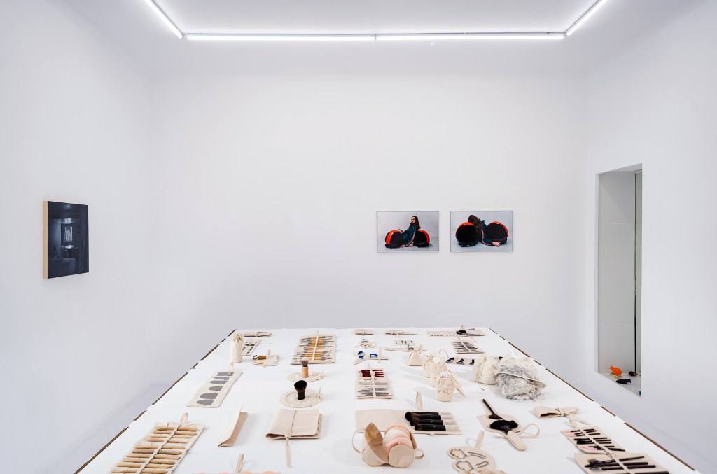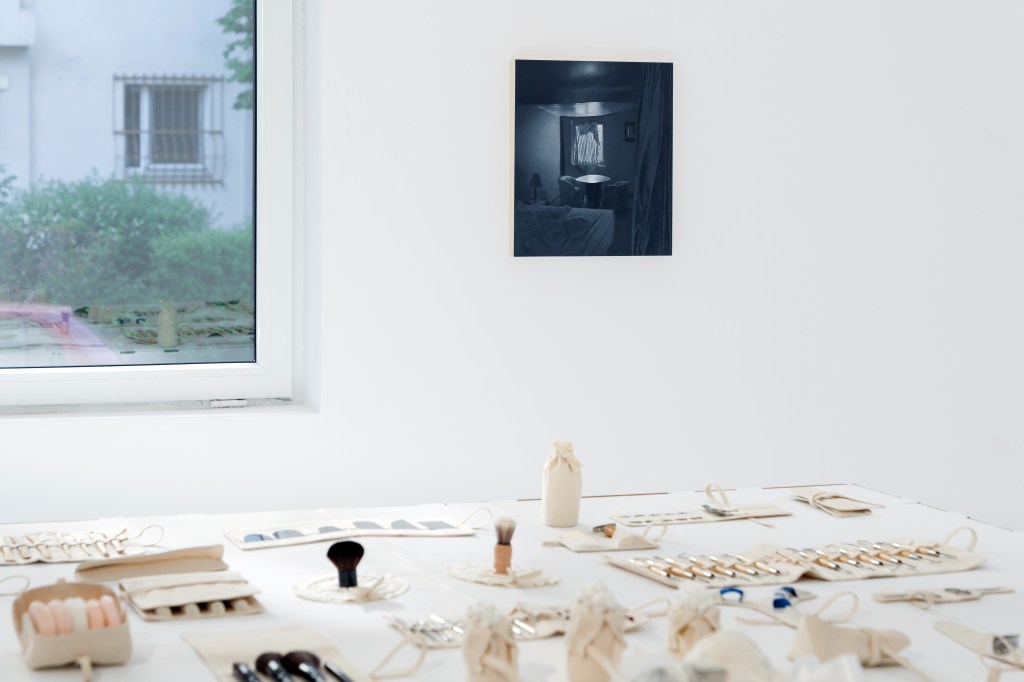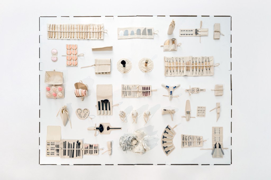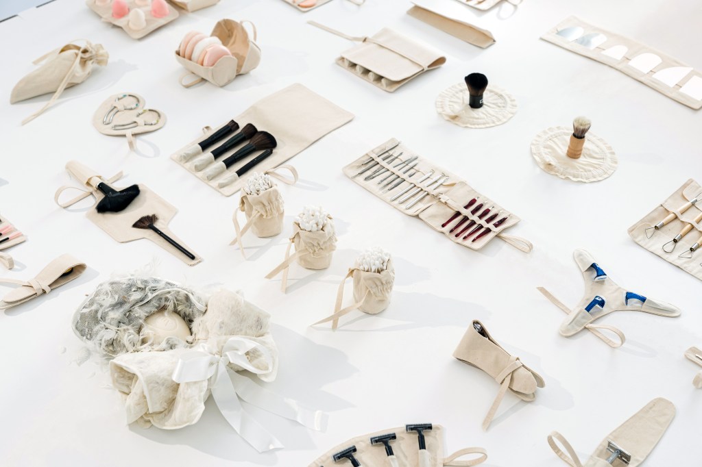 Bruno Zhu‘s Joy (b. 2019) is a bar of soap resembling an egg on a feathery nest alongside cosmetic accessories kept in bespoke canvas pockets. Joy was born in 2019 in New York and is surrounded by beauty products. We project anthropomorphic behaviour onto this piece of soap because it is presented as a baby associated with gendered signifiers of a possible future: beauty blenders, cuticle cutters, tweezers, and makeup brushes. The assemblage humorously reflects the standardisation of social behaviour and exposes the assumption that our bodies are naturally oriented toward certain objects from birth. Our interactions with things can be seen as programs of action that structure social reality — some performed by humans, others entrusted to non-humans.