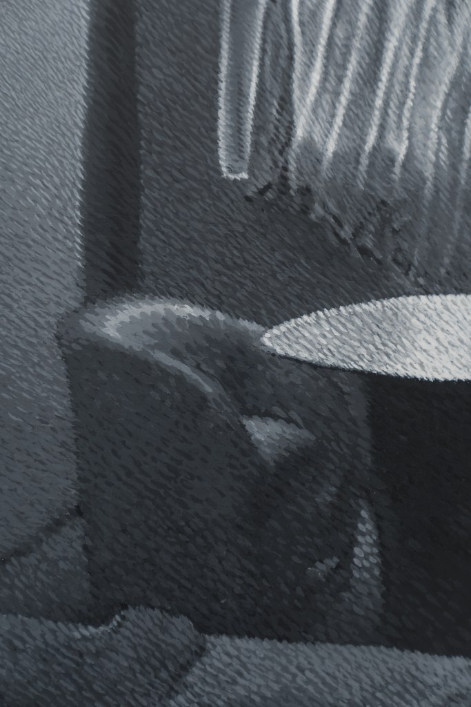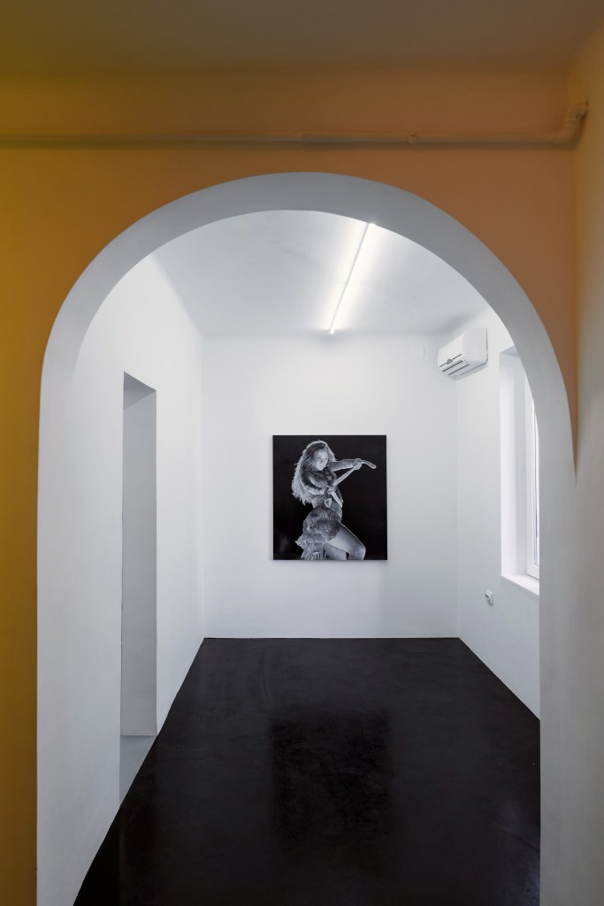 Xavier Robles de Medina has developed a collection of found images drawn from online platforms and printed matter. Through appropriation and erasure, these materials become part of his visual vocabulary, as he strips away colour and subtly alters their form and texture. For Dreams Made Flesh, Robles de Medina translated two composites of four photographs into paintings. One, a portrait of Shakira at the 2020 Super Bowl Halftime Show, merges multiple angles of the singer glaring at her audience; through repetition, the acrylic-on-wood painting absorbs the affect of its subject and turns its gaze back upon the viewer. The other, a composite of four interiors, depicts only furniture and drapery. In the absence of people, the domestic objects appear animated, engaged in their own exchange. While one painting performs human presence, the other stages a conversation among things freed from their users.