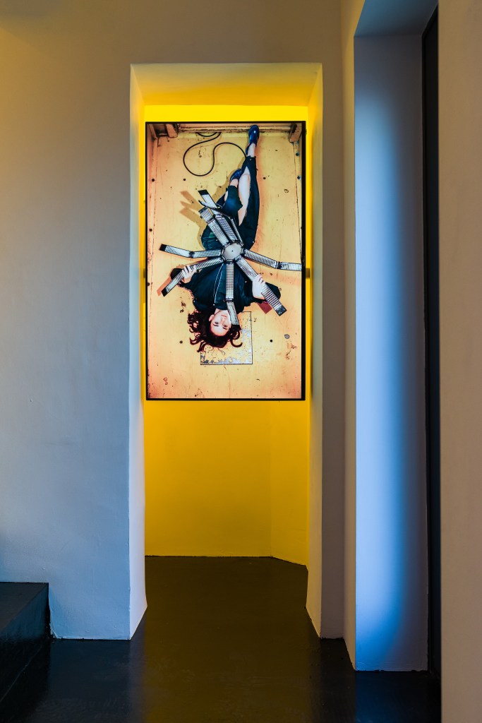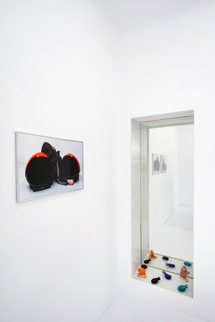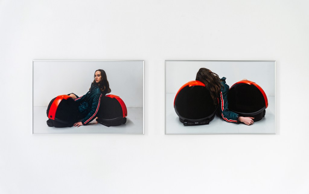 Catinca Malaimare premiered Eight of Clubs |♧|, a film in which she manipulates a LED photography light composed of eight limbs joined by a circular core, a form that resembles both a spider and a withering flower. The work creates a sensuous experience, amplified by the sound of skin rubbing against plastic as the artist tests the limits of her anatomy, using the full reach of her body to grasp the object’s limbs. Intimacy between human and machine also appears in new prints where Malaimare poses with two Discoverer Space Helmet TVs from the 1980s — alternately confronting us with a challenging gaze or dismissing us by looking away. She also presented live performances that revealed how anthropomorphic technologies captivate the senses and stir emotions such as fear, desire, and love.
