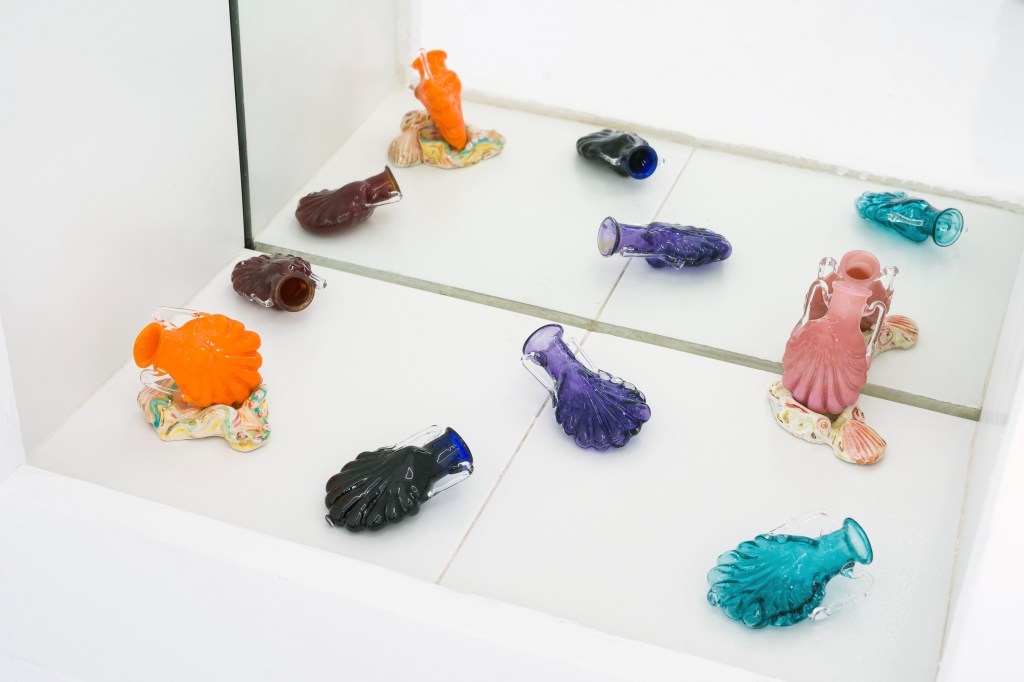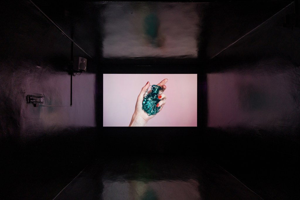 Sunday Fantasy (2019) by Zoe Williams is a film and installation inspired by a Roman perfume bottle the artist encountered in the British Museum. Its protagonist, Veronica Malaise, is played by four different actresses, each interpreting the character in her own way and using the ancient vial to conjure intimate fantasies. Drawings, ceramics, and glass replicas of the bottle — originally made as film props — extend the playful universe of Sunday Fantasy into the gallery. If social norms have scripted our relationships with objects in ways that reinforce binary gender roles, Williams invites us, through seduction, fetishism, and witchcraft, to reimagine desire outside such prescriptions.